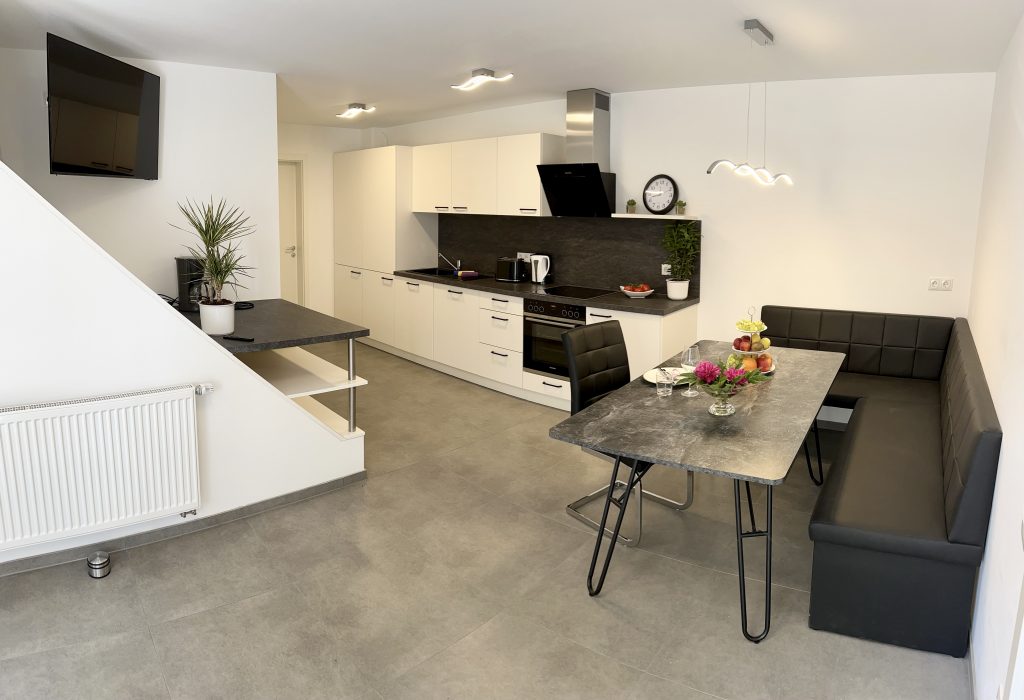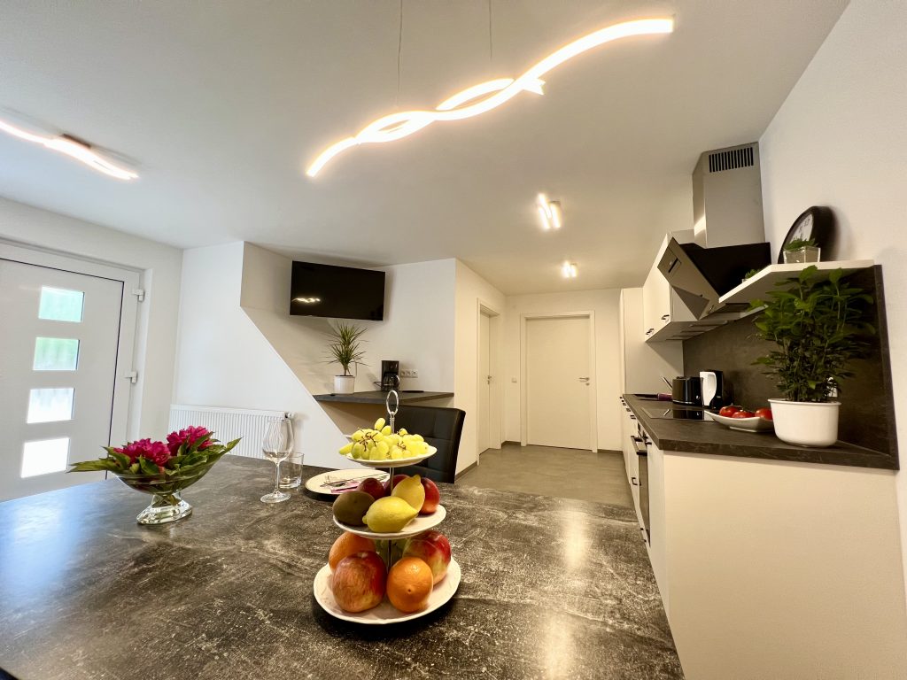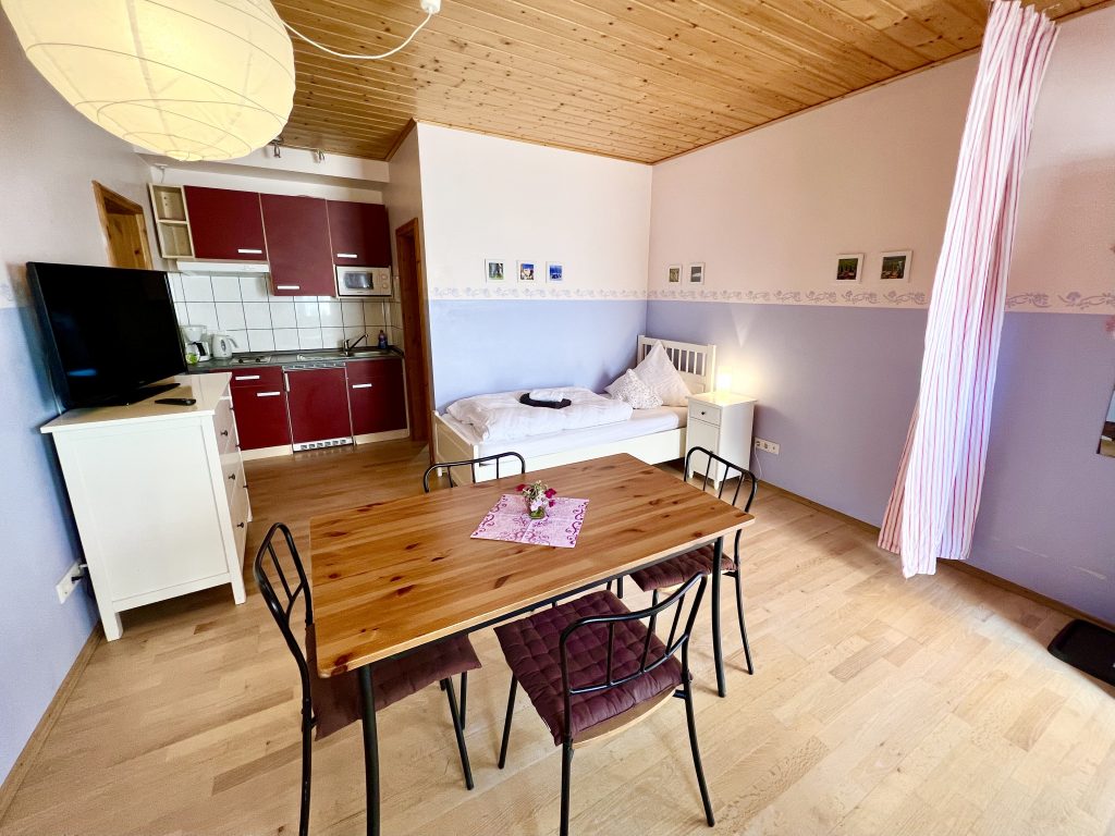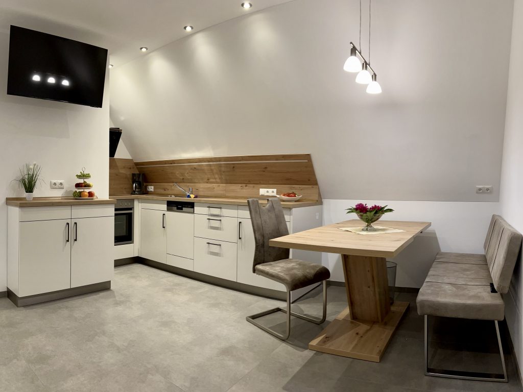 - gemütliche, voll ausgestattete Wohnküche mit Kühlschrank, Herd mit Backofen, Spülmaschine, Kaffeemaschine, Wasserkocher, Essecke und großem Sat-TV