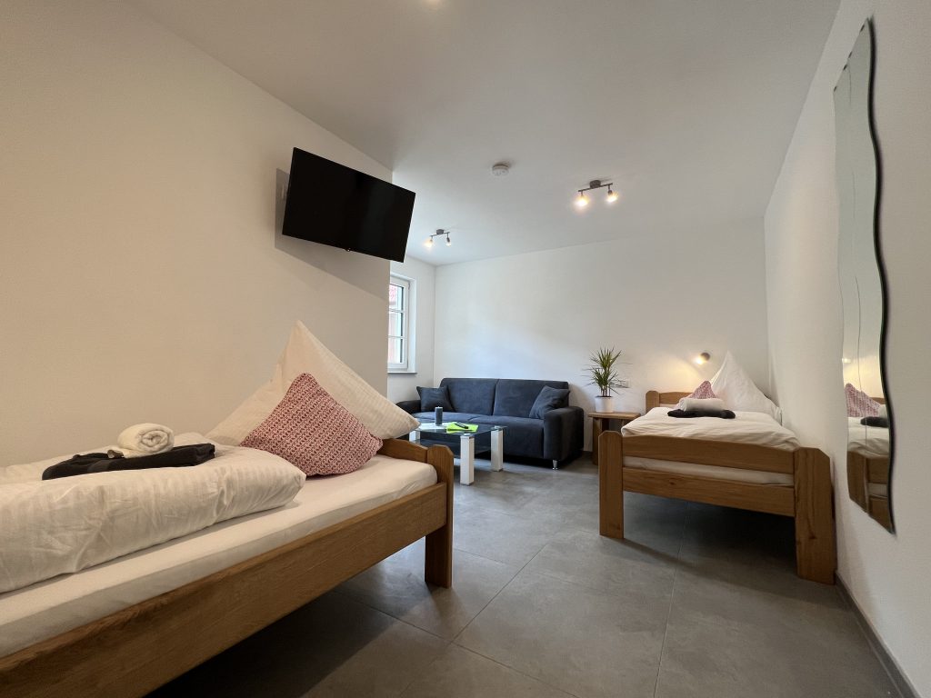 - Schlafraum mit zwei getrennten Einzelbetten, Sofa und SAT-TV